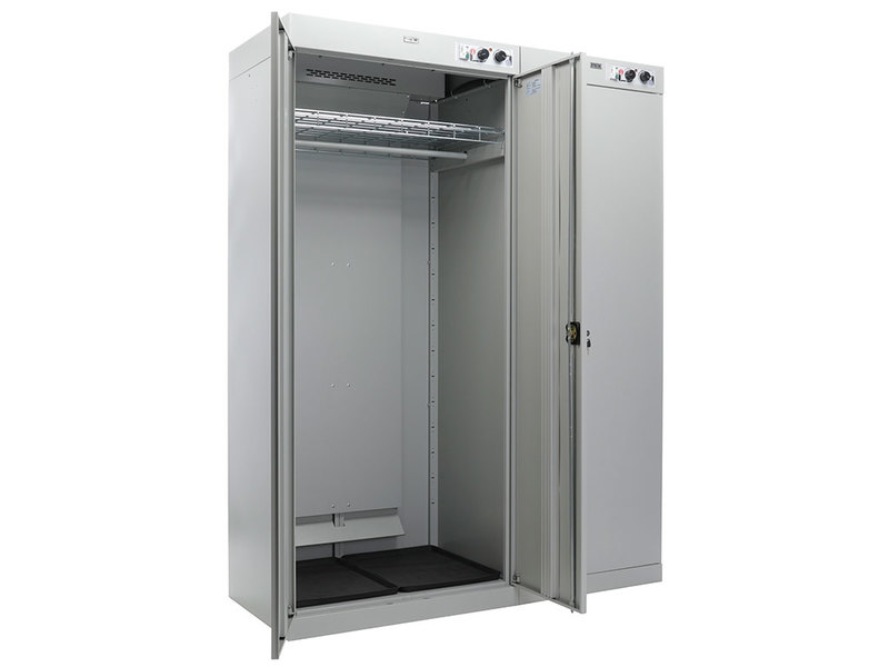 - шкаф состоит из двух независимых секций. Первая двухдверная для одежды, с перекладиной для вешалок и полкой. Вторая - для сушки обуви, оборудована патрубками для развешивания